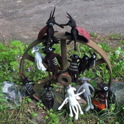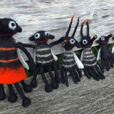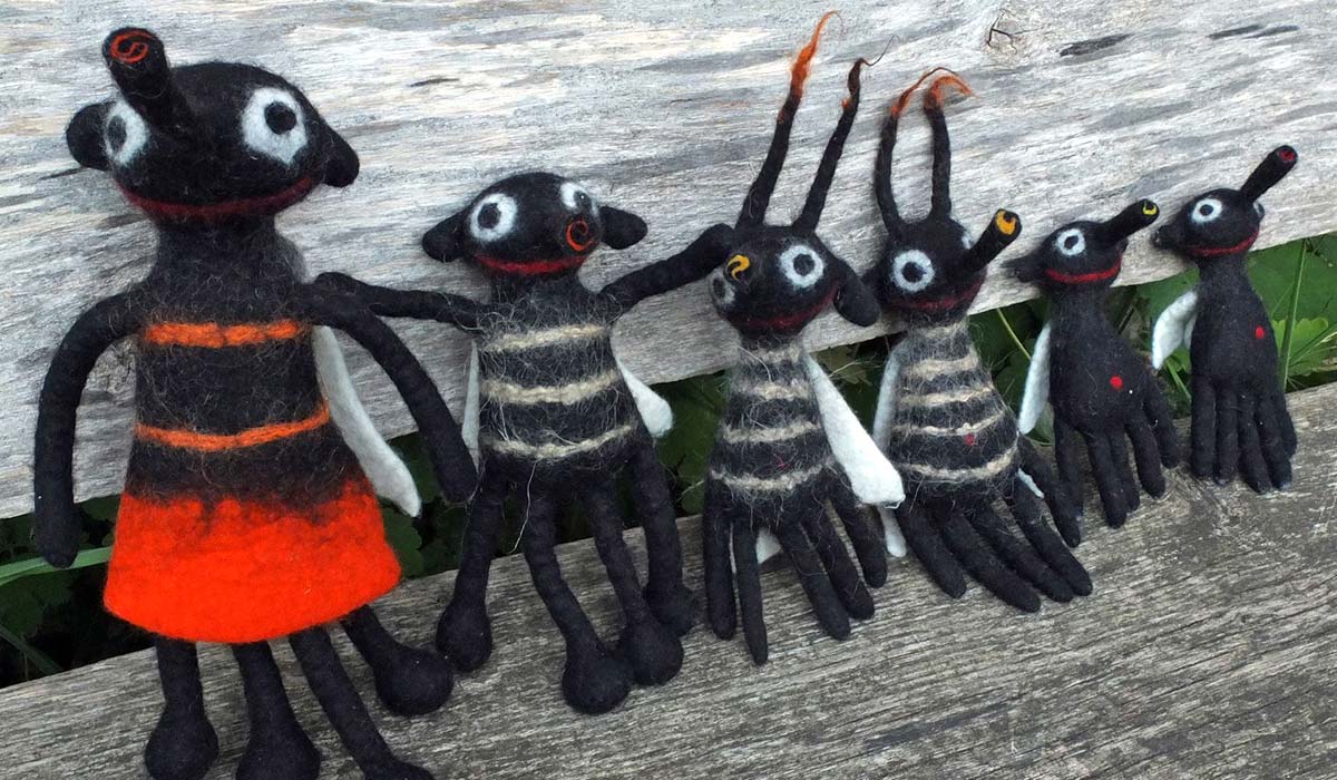 Geziefer to go - Hosentascheninsekten, denen es nicht schadet, mitgenommen zu werden - von links nach rechts: Hummel mit Kleid, Hummel ohne Kleid , zwei Bienen , zwei gemeine Stubenfliegen