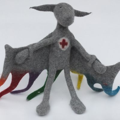 Fledermaus mit guter work - life - balance: Sie hat Flughilfen an den Flügeln, um beim Retten die Arme frei zu haben. Wenn sie genug getan hat, hängt sie sich kopfüber irgendwo an.