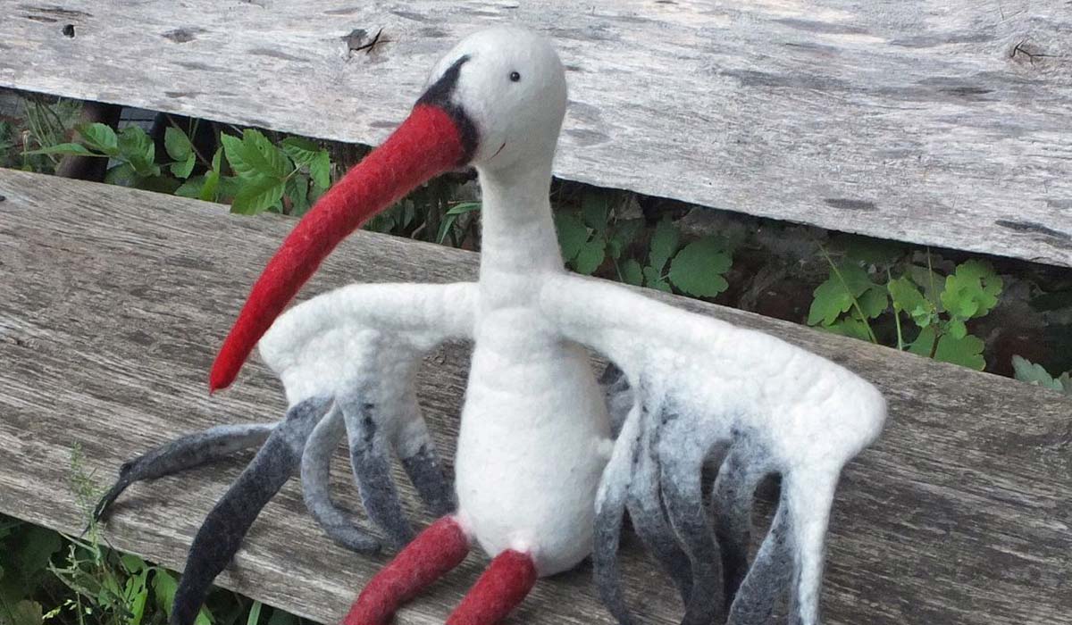 Mit Socken und Hüftstrümpfen wird dieser Storch niemals nasse Füße bekommen.