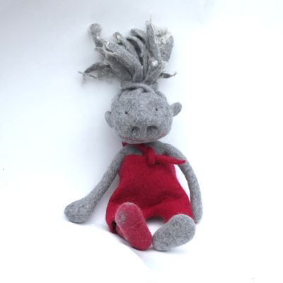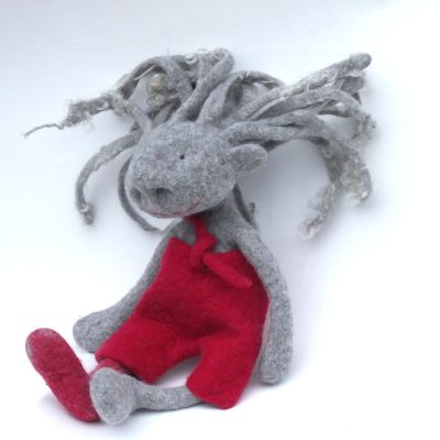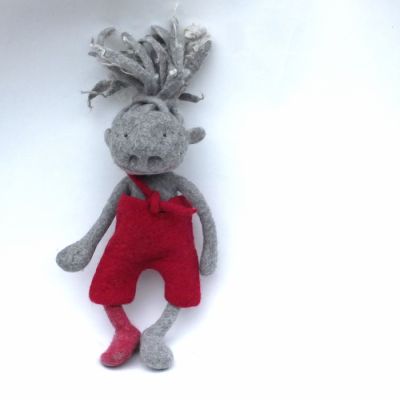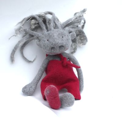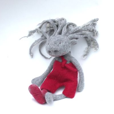 Diese Naslings-ur-oma kann nun wirklich fast alles - wer mal nicht in seiner eigenen Nase bohren will oder soll hat einen fast ebenbürtigen Ersatz. Sie - ich glaube, es ist eine "sie" - hat vielleicht einen Gipsfuß. Wahrscheinlicher ist, dass ihre zweite Socke von der Waschmaschine verschluckt wurde. Eine Neue könnte sie gebrauchen, aber von mir kann sie die leider nicht bekommen, denn ich kann zwar Socken stricken, aber ich will es nicht tun :) Ihre Hose ist brombeerpink, sowas gibt es bei Viecheria selten und die Haare haben Locken an den Enden. Sowas gibt es eigentlich nie.
