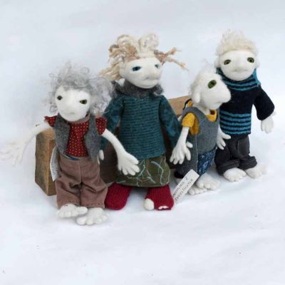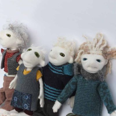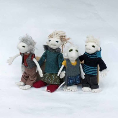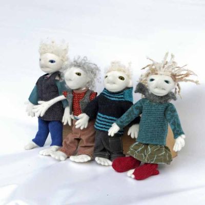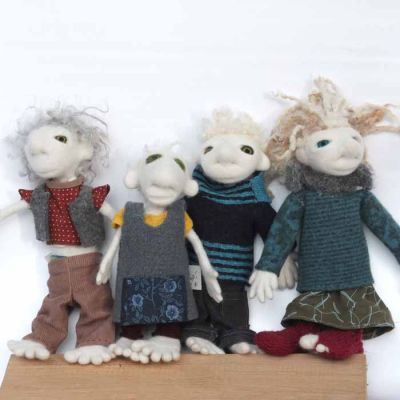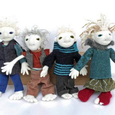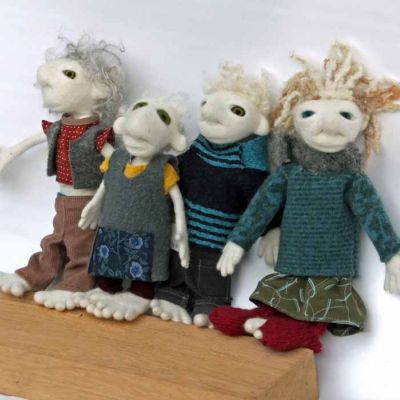 Also hier jetzt ...... Uromimis Enkeltöchter und - söhne: Sie sind handspannengroß, passen in normale Hosentaschen und tragen im Fluggepäck nicht auf, sie sind waschmaschinengeübt, aber nicht ce-norm gerecht, denn die Klamotten sind aus allem, was ich finde und niemand hat meinem alten Rock die DIN - EN71.3 bestätigt :) Eine gehört seit 10 Jahren mir und ich verleihe sie manchmal, wenn eins meiner Kinder und Enkel Bärenkräfte in Form von Großmutterkräften braucht:) Oft suchen sie sich ihre Besitzer:innen selbst aus ;) Für Kinder finde ich sie nicht geeignet, obwohl sie bis auf die Klamotten natürlich genauso echt und gut sind, wie alle anderen Puppen und Viecher von mir. Die kleinste mit dem gelben Hemd ist von Maud gebaut, die mit den dicken, großen Pullovern sind gerade erst - kurz vor der Fangfrisch - Messe fertig geworden. Hier kommt eine Notlüge, weil es zwar zu meinen Begabungen gehört, kleine, lustige Dinge zu bauen, aber trotz Engelsgeduld finde ich es nicht so entscheidend, ob bei den Klamotten die Fäden zusammenpassen, sie sollen stabil sein UND es darf echt nicht länger dauern als absolut nötig : Die Kleider haben Uromimis Enkel sich selbst genäht und gestrickt - das machen sie heimlich und naja - echte Schneider:Innen würden ihre Freude daran haben, wie schnell das geht und sich vor Schrecken, die Augen zu halten, denn nichts ist geheftet - alles Freiform. Sie, die Uromimisenkelsöhne und - töchter wühlen sich nachts "oh, ich habe ja noch nichts anzuziehen" durch die Kiste mit Puppenklamottenstoffstückelchen und Puppenklamottenpapierschnittentwürfen und basteln wilde Kombinationen. Das sehen Sie ja, was dabei herauskommt :)